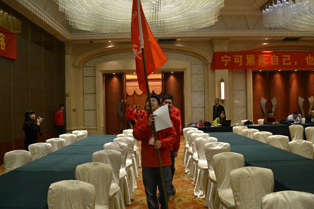 傍晚18:30,全國經(jīng)銷商身著奇力吊頂紅色戰(zhàn)衣,用井然有序的四個方陣步入會場,本次大會分為四大隊伍:戰(zhàn)神隊、奇跡隊、冠軍隊、超人隊。每個隊伍由十幾個地區(qū)的優(yōu)秀經(jīng)銷商代表組成,他們將在今明兩天的活動中為各自的隊伍“參戰(zhàn)”,奮力贏取積分。