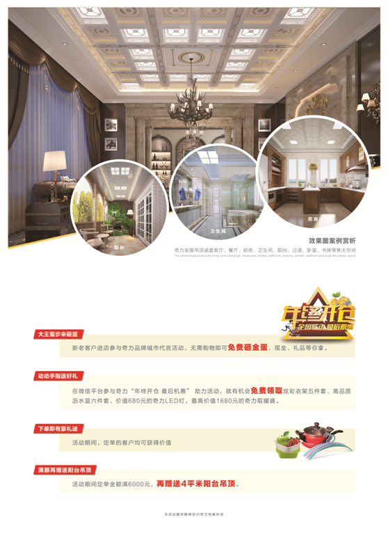 本次活動內(nèi)容豐富,新老客戶進店參與奇力品牌城市代言活動,無需購物即可免費砸金蛋,現(xiàn)金、禮品等你拿。活動期間,定單的客戶均可獲得精美禮品一份,驚喜不斷,活動連連,更多的內(nèi)容煩請進店咨詢,走過路過奇力吊頂專賣店,一定不要錯過。